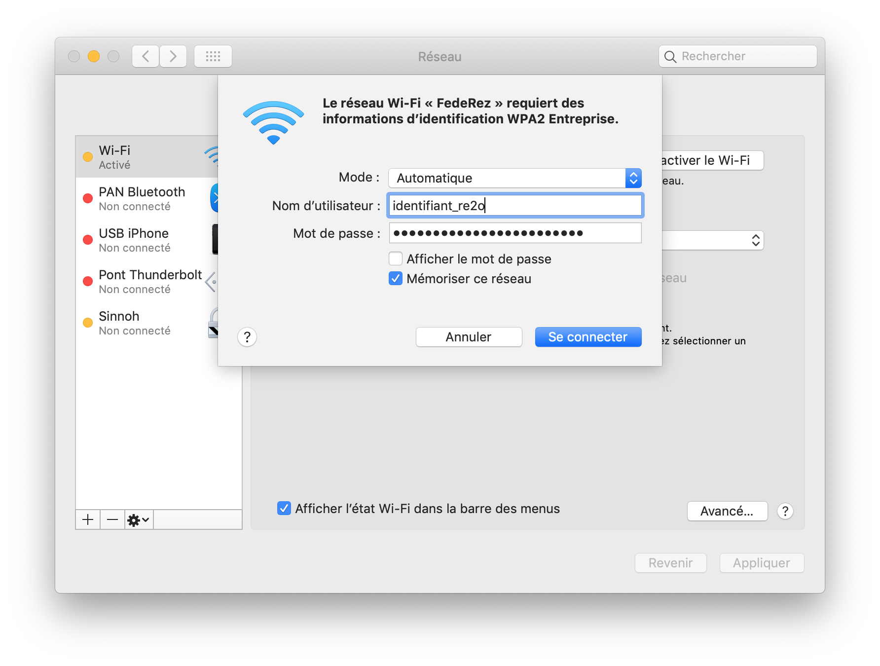 Merci de patienter 5 à 10 minutes que l'ajout automatique soit pris en compte. Si après 10 minutes vous ne parvenez toujours pas à vous connecter, vous pouvez passer au local Rézoléo pour régler le problème.